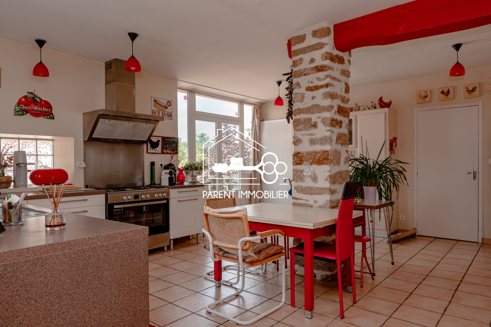 - Un salon cosy avec cheminée, une salle à manger, une cuisine équipée et une suite parentale (chambre, salle d’eau, rangements).