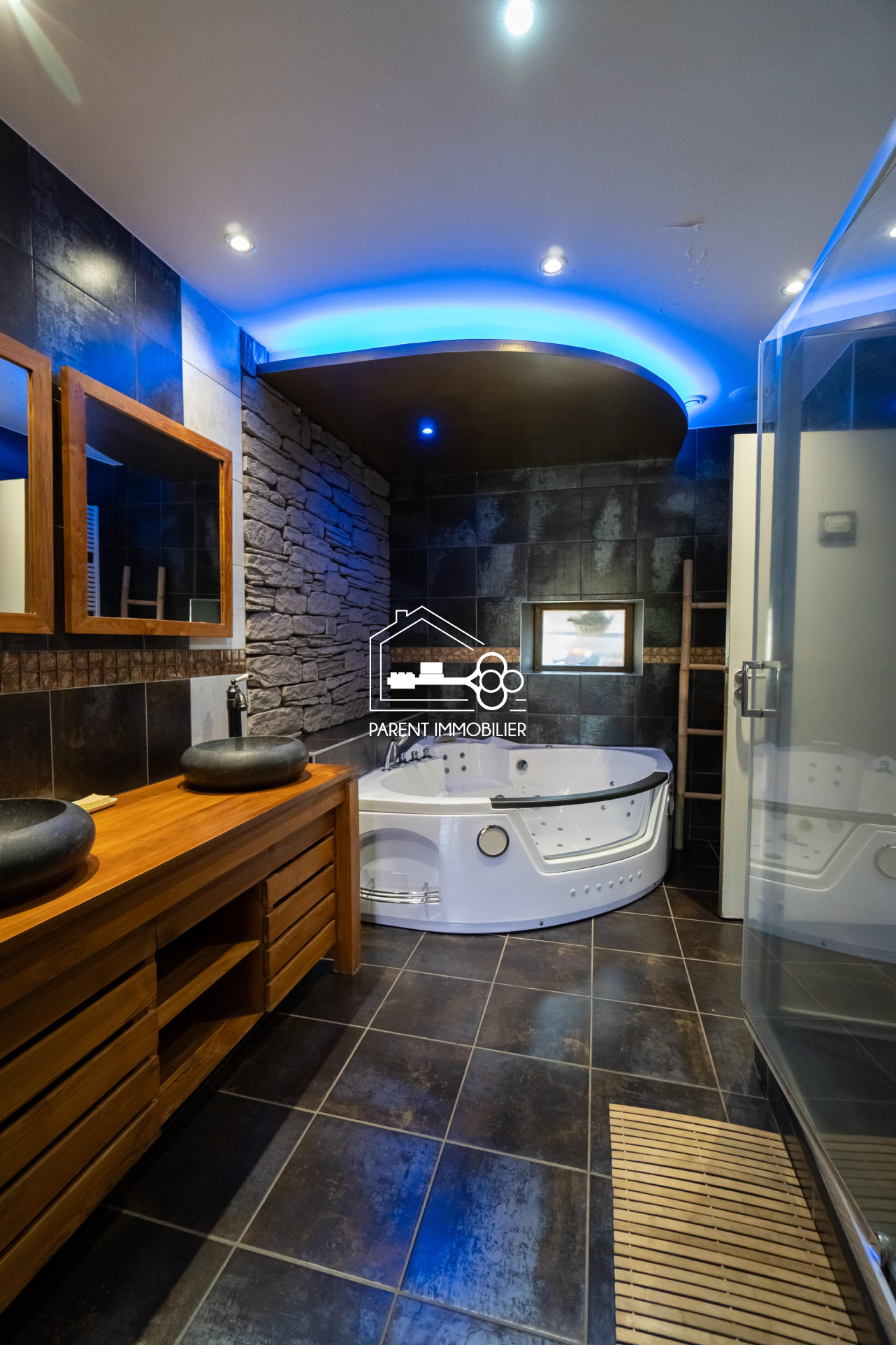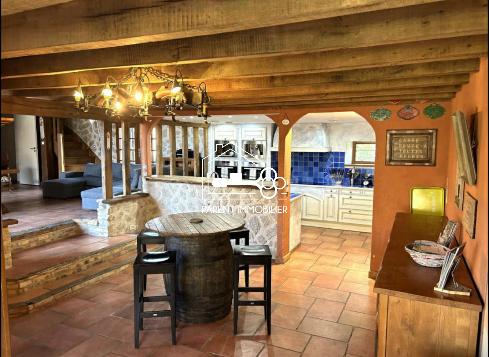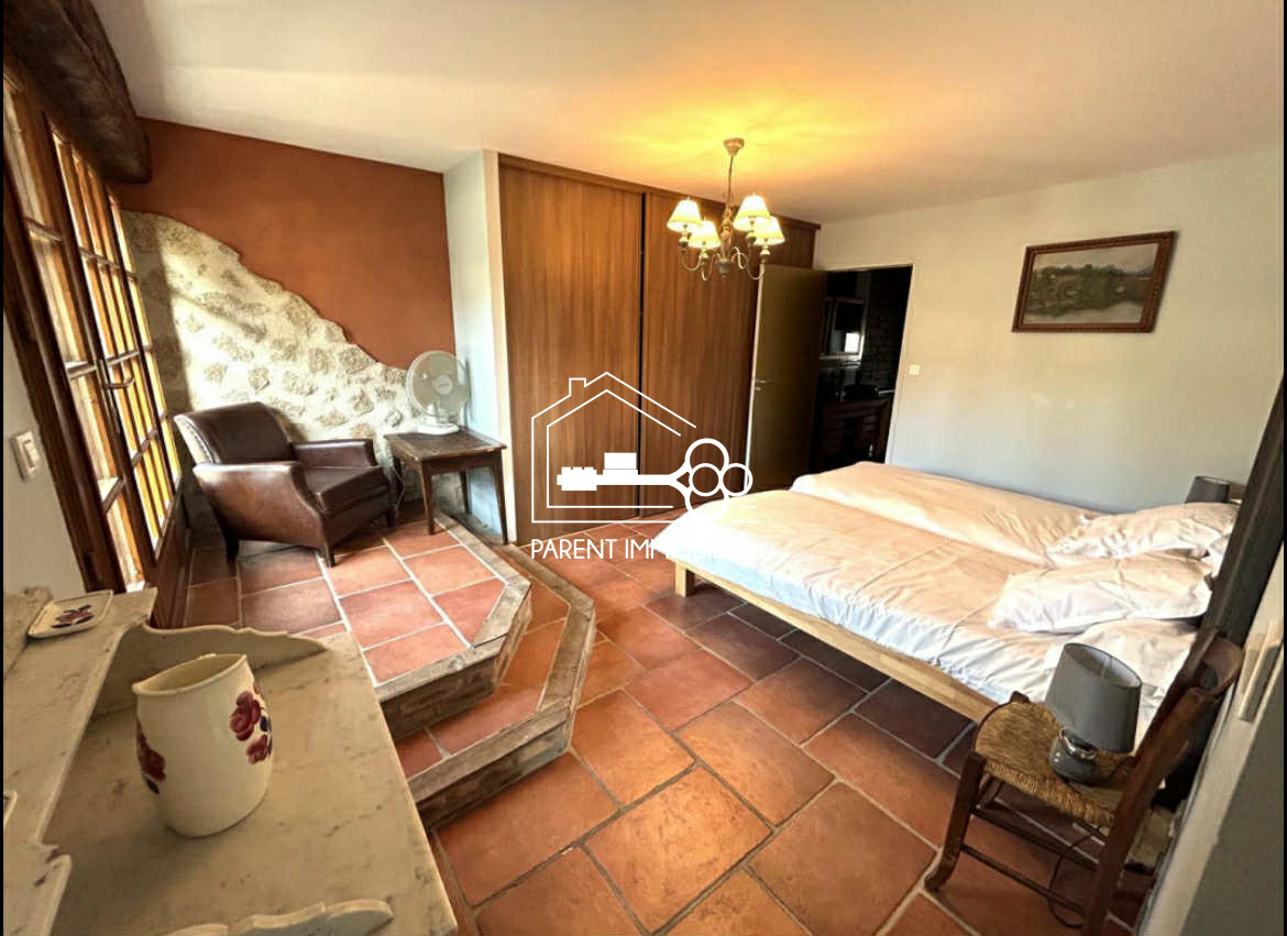 - Rez-de-chaussée : vaste pièce de vie pleine de charme avec poutres apparentes, cheminée et pierres apparentes, cuisine ouverte entièrement équipée, WC séparé, une chambre, une salle de bains avec baignoire à jets et douche.